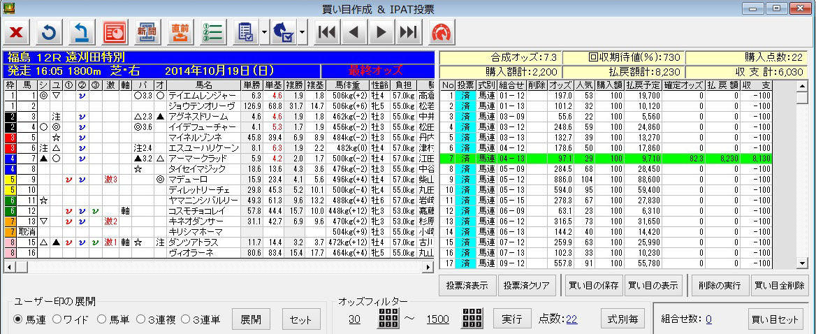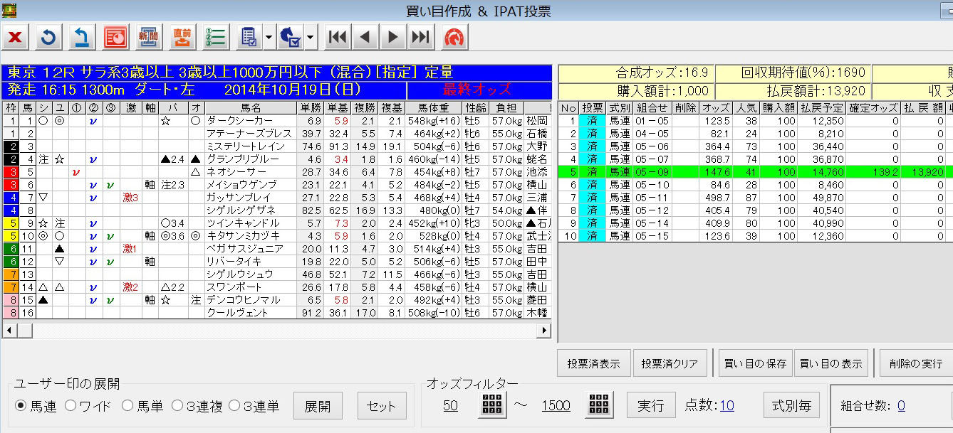 よってここは、以前から狙っていた5番ネオシーサーを軸に、ユーザー印+極軸を相手に馬連流しで勝負。
