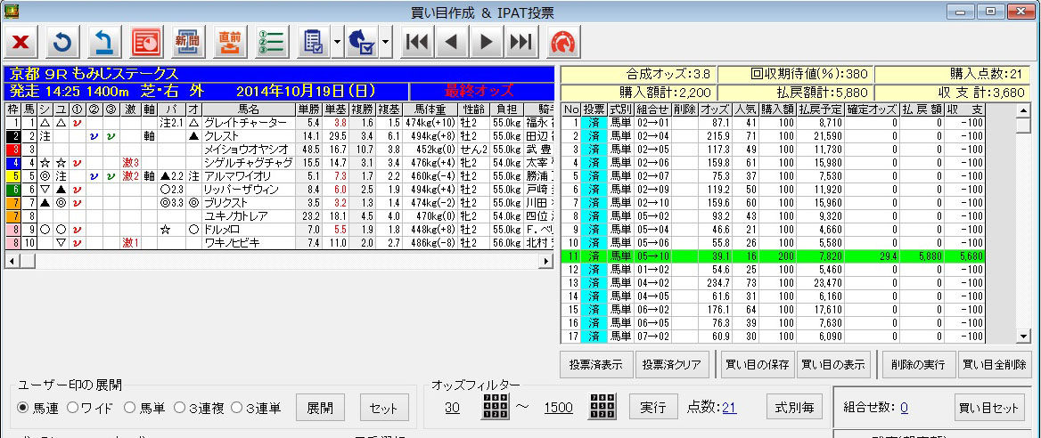あと、ユーザー印◎のシェール、高配当狙いでデカントラップ、ユーザー印▲のジャストザブレインを1着候補として、馬単フォーメーションを組んだ。