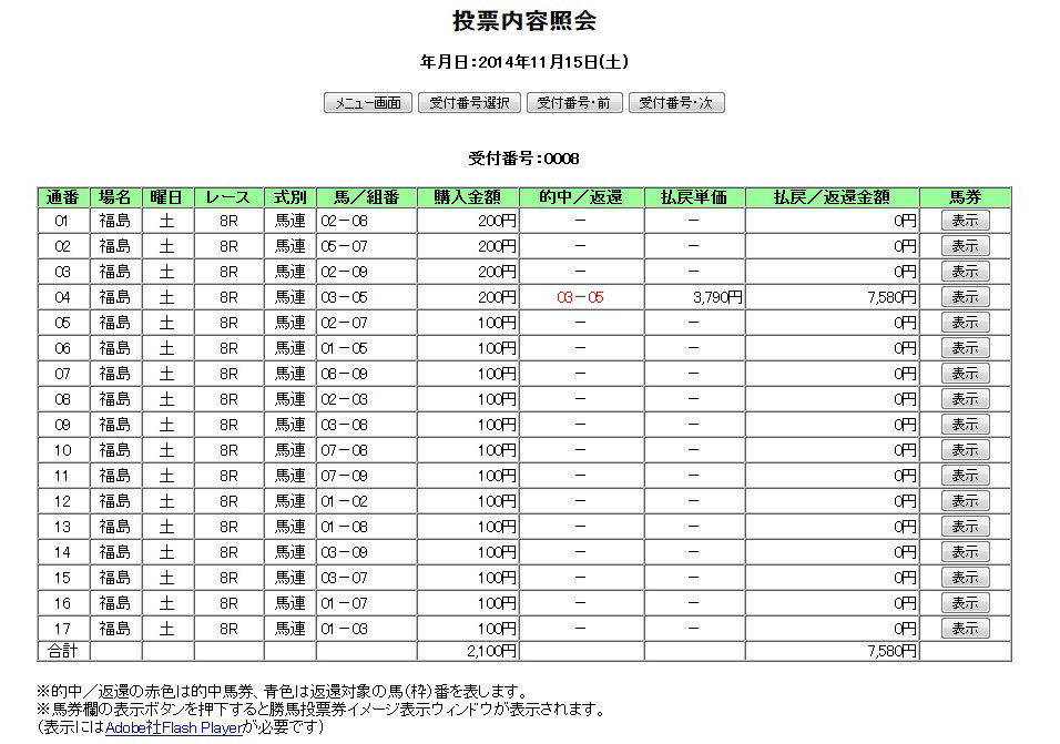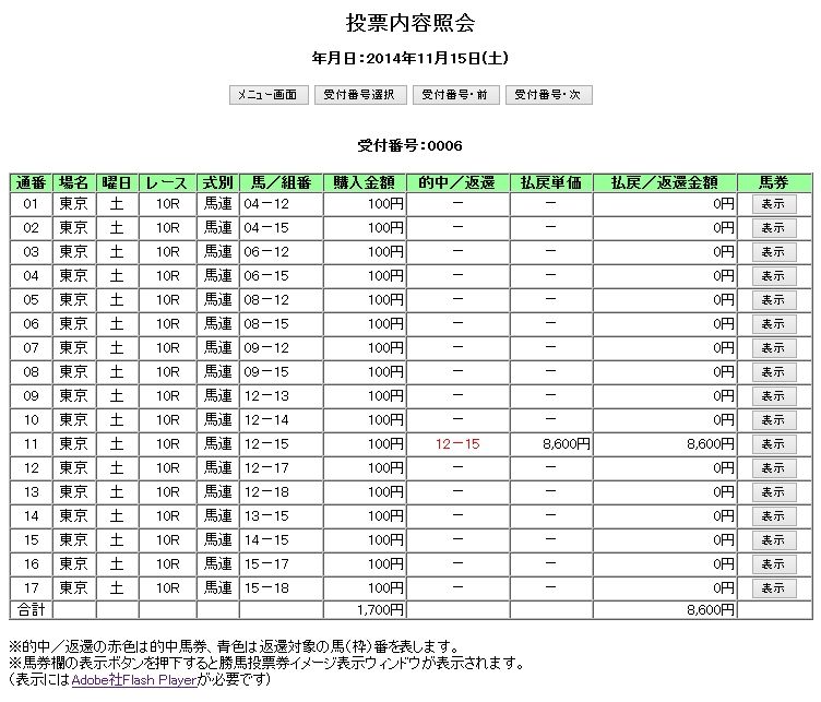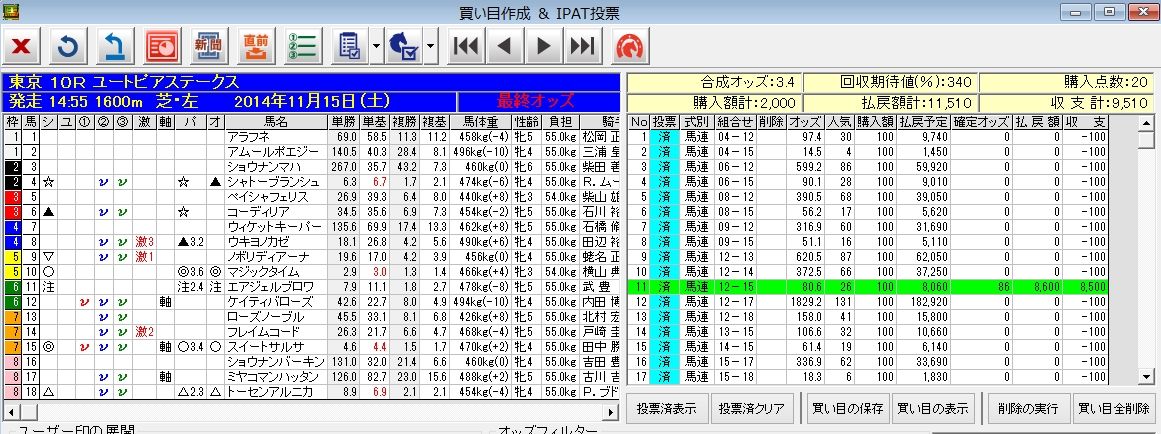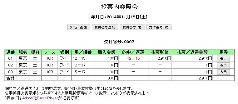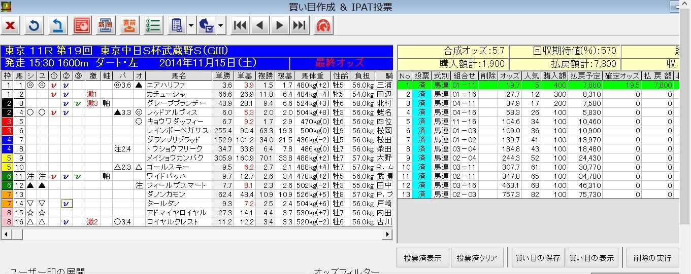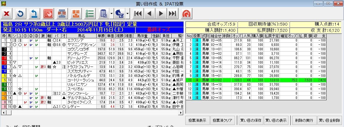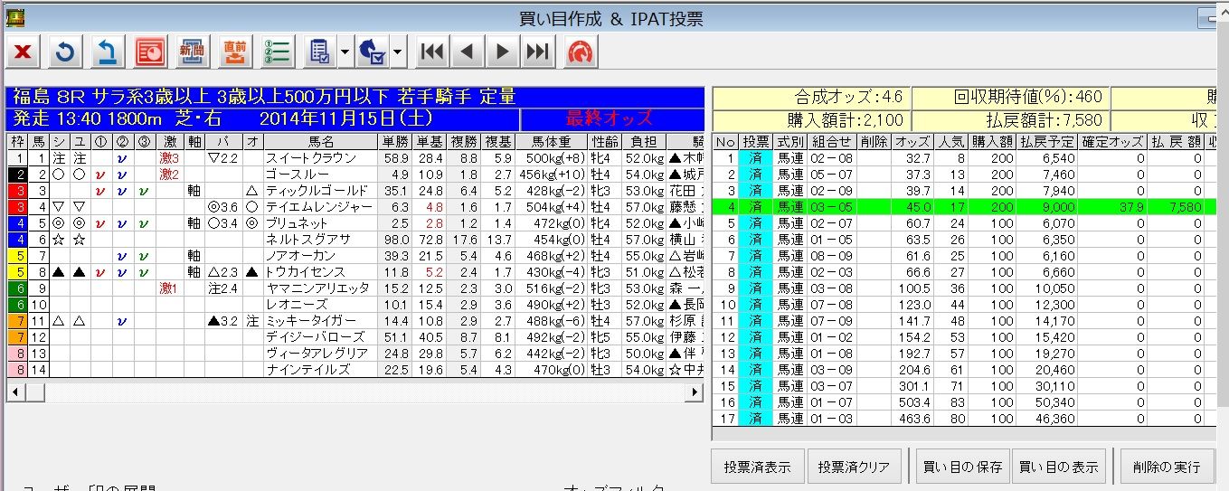 そのかいあって、11月2日(日)の東京2Rで、馬連7万馬券+ワイドダブル万馬券を的中することができた。