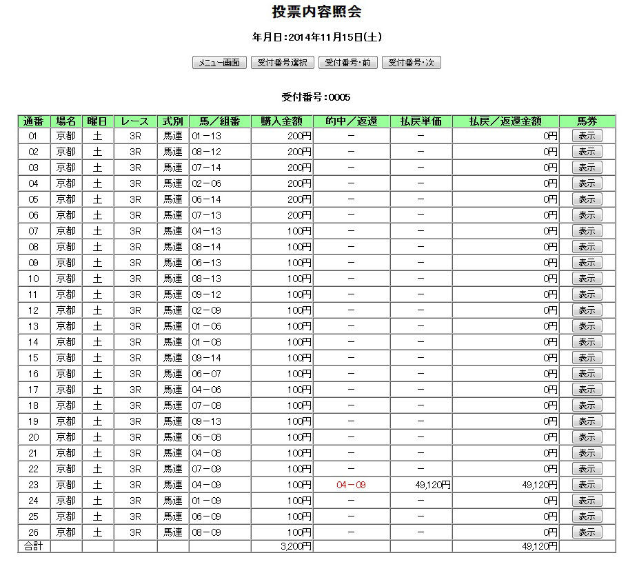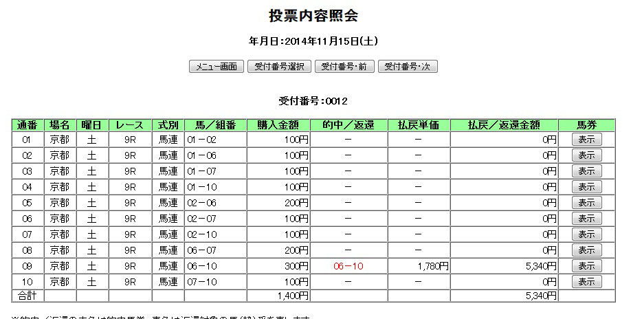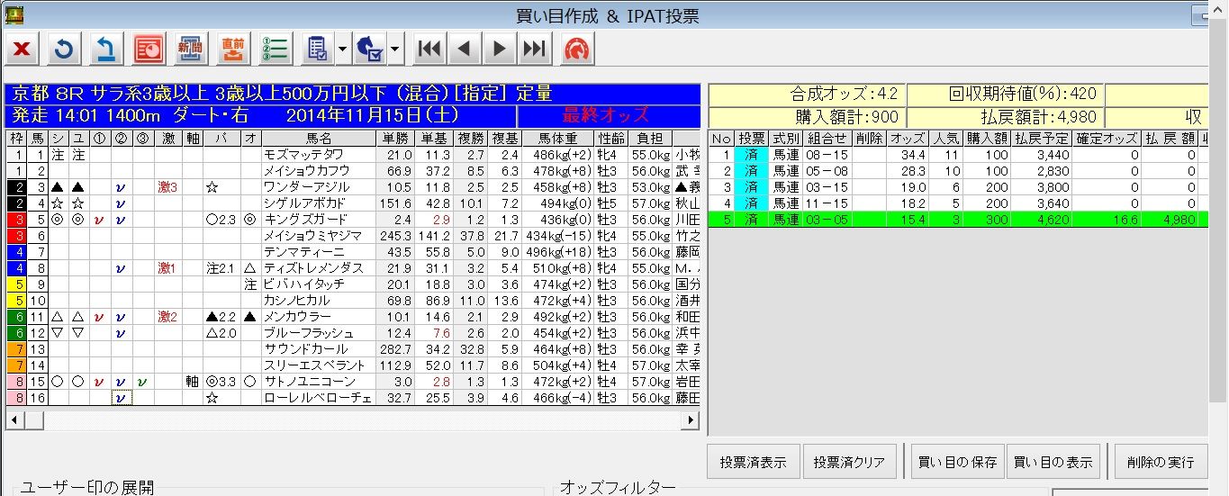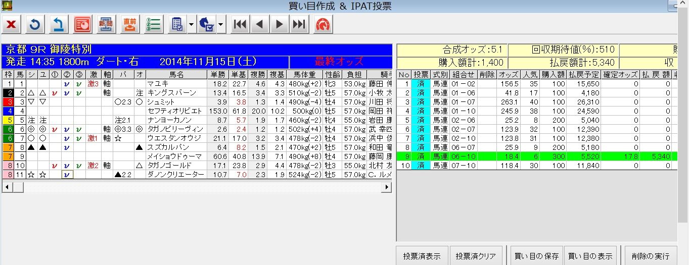 この極軸とシステム印◎の5番キングズガードから、先の設定どおり、激走馬を相手中心とした馬連を、テスト的に購入。