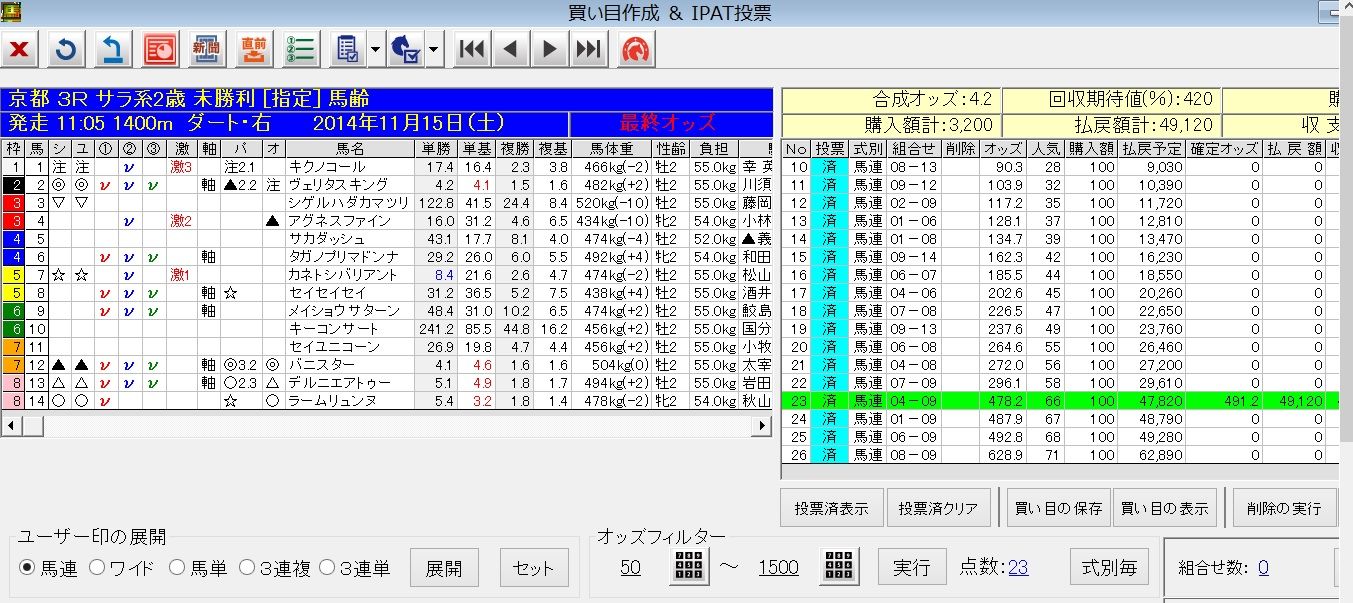 あとは、ユーザーデータ設定から、ユーザー印で◎がついた13番ファンファーレも1着候補において、馬単を購入。