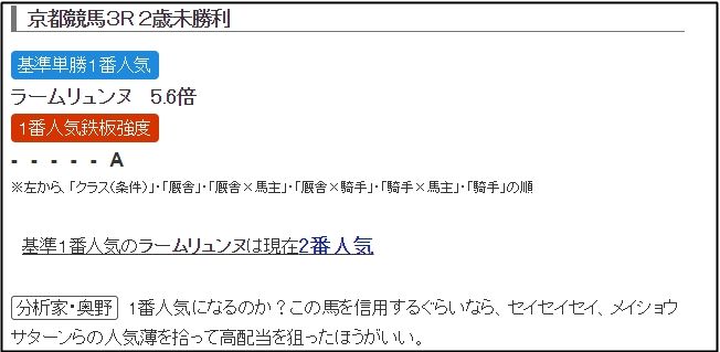 あと、ここで気になったのが、奥野さんの「1番人気直前診断のコメント(競馬ビッグデータ・ブログ)」。