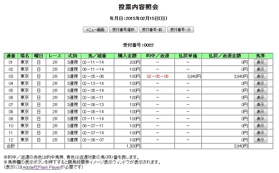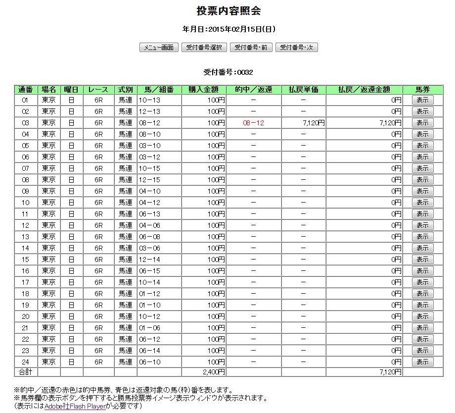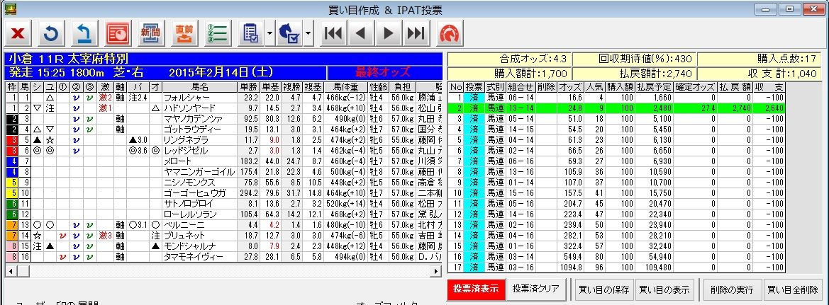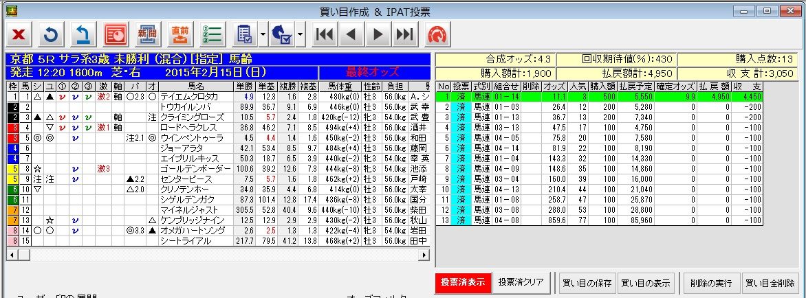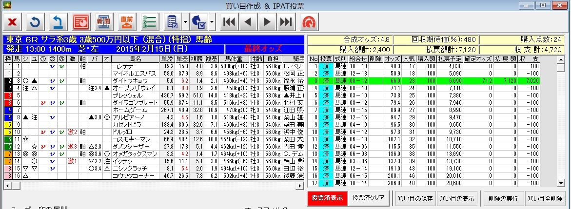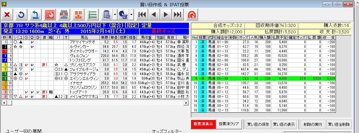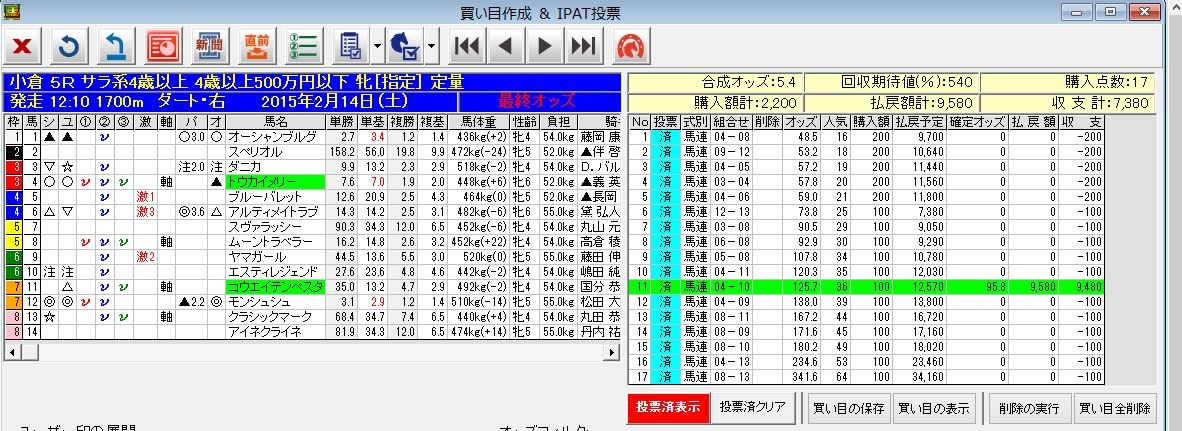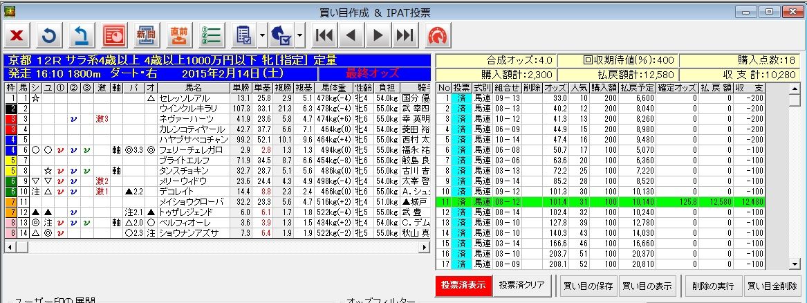 とりあえず、全極軸から馬券を組んで、安い配当の目を削除する。