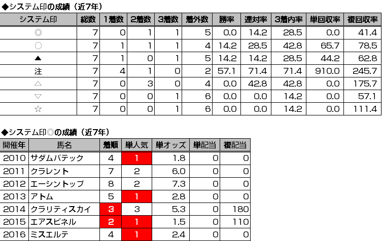 まだまだキャリアの浅い2歳のGⅠなので、キャリアを重ねた馬および前走が重賞だった馬が高い能力指数を記録しがちです。(これは指数の性質上仕方がない面があります)それでも上位の成績が良いということは、①前走が重賞だった馬②前走が条件戦の場合は好タイムで勝っている馬を買うべきであることとイコール。中山開催時ではありますが、穴をあけたロゴタイプは東京のマイル戦を好タイムで駆け抜けていました。