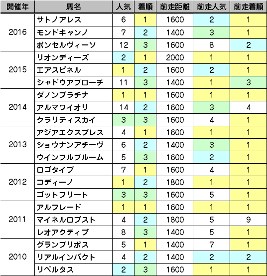 21頭中16頭が前走で1着だった馬でした。2歳戦なので前走着順が悪い馬がそもそも出られないことを加味しても、面白い傾向ではないでしょうか。配当的に面白いのは16年のボンセルヴィーソ、15年のシャドウアプローチなど、前走で重賞で3着以内に入りながらも当日2桁人気にまで人気を落としていた馬。カシアス(京王杯2歳S・2着)、ケイティクレバー(京都2歳S・3着)、ケイアイノーテック(デイリー杯2歳S・3着)が候補ですが、果たして。この中からどれを選ぶかは随分センスが問われそうで。。。