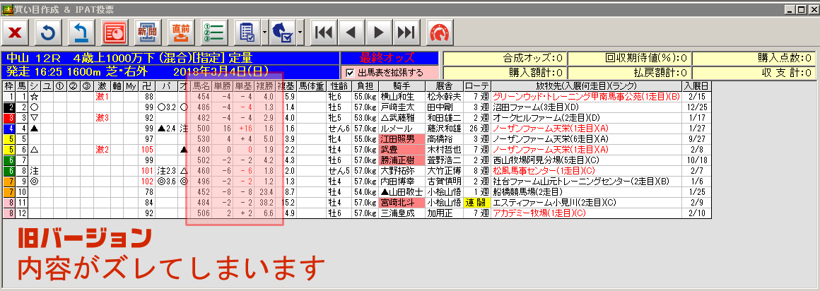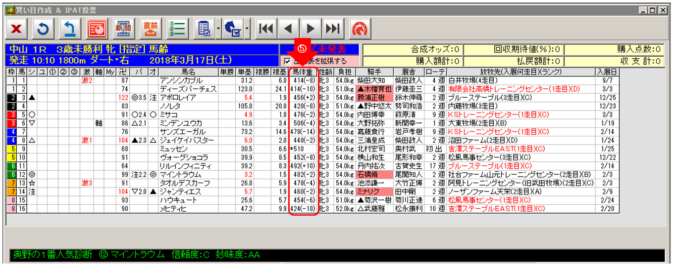 ⑤ Ver 1.3.0(β版)では馬体重を表示できませんでしたが、