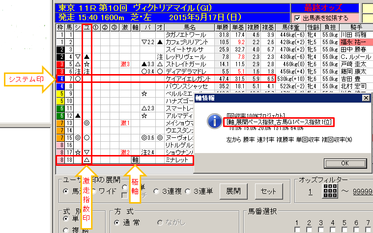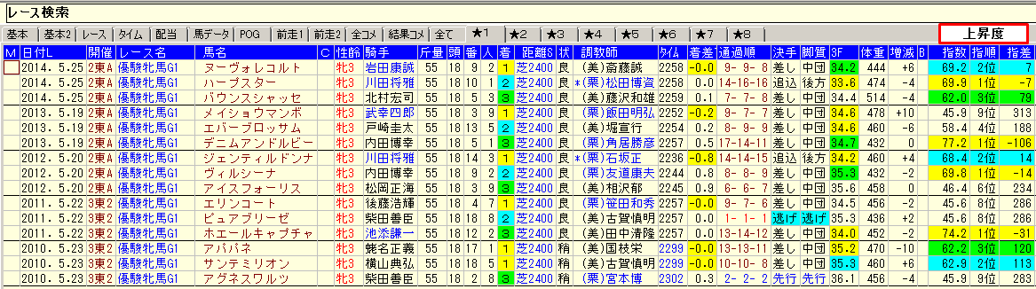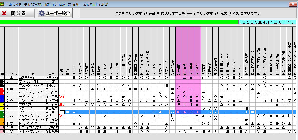 皐月賞と同じように、展開指数、速度指数、位置指数などに、高い印が打たれてました。