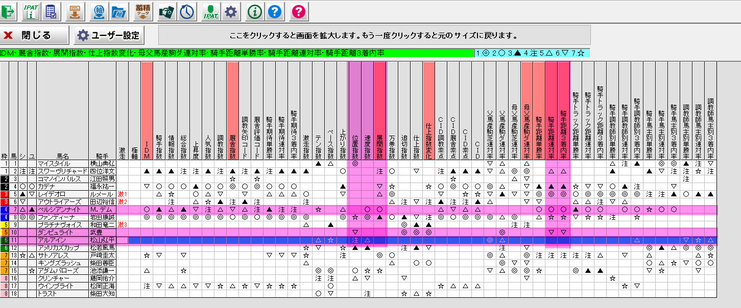 ピンク色で囲んだ部分が、馬券に絡んだ3頭、ないし2頭に対して、マークが入っていた項目です。